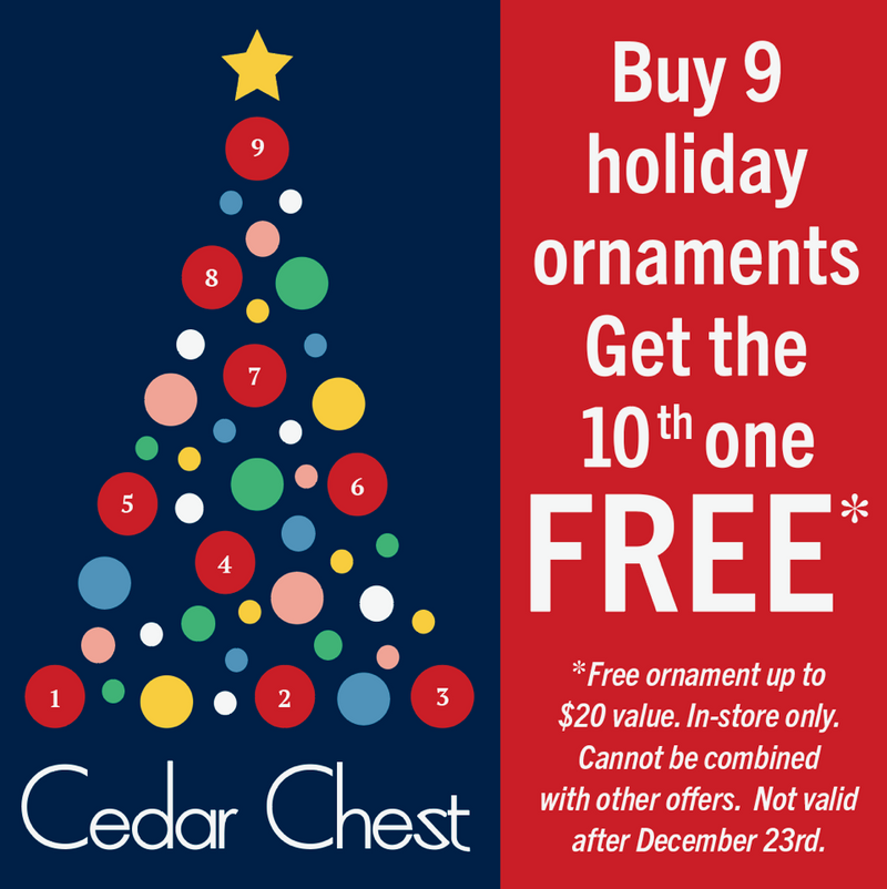 From traditional to pop culture, shop our extensive ornament collection in-store and receive your 10th ornament free!